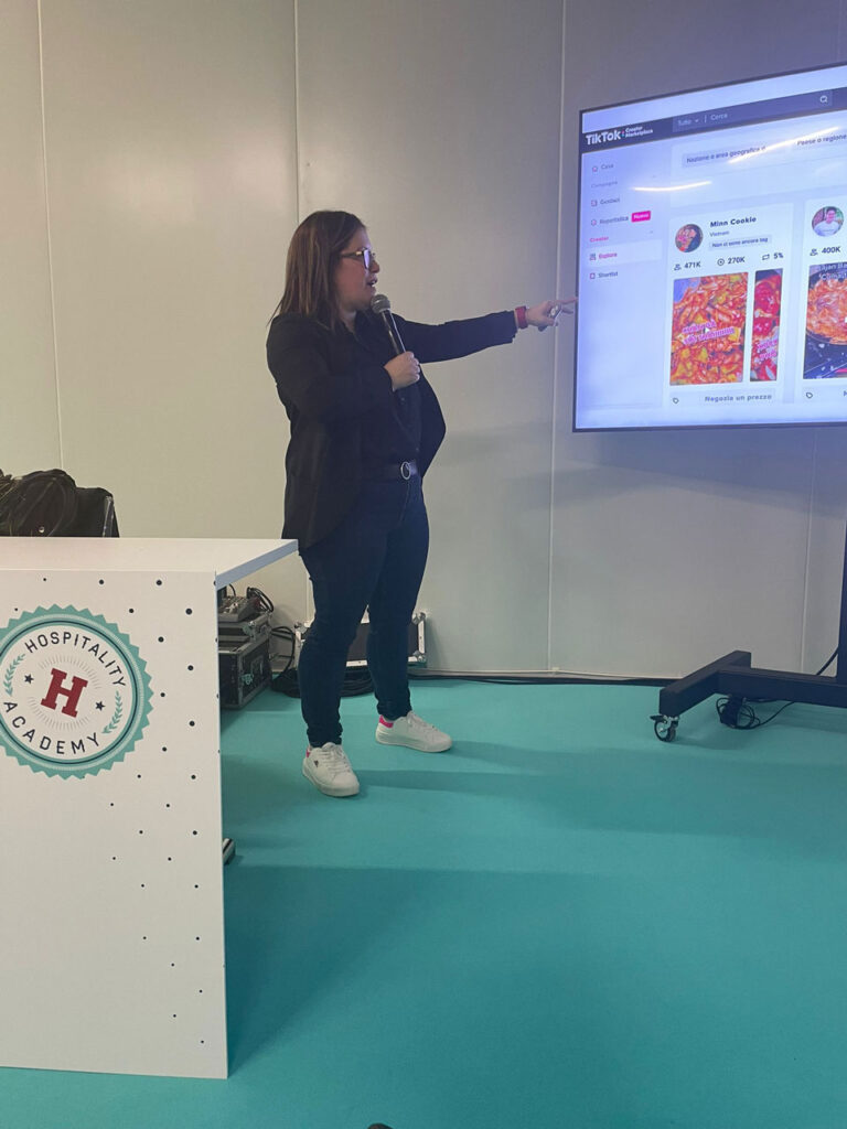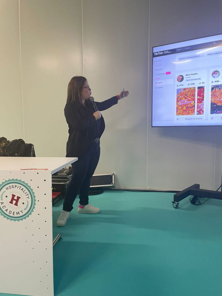Nel 2023 sono intervenuta come speaker in occasione dell’edizione dell’evento fieristico dedicato al settore Ho.Re.Ca., tenutasi a Riva del Garda. Ho presentato un intervento focalizzato su come la piattaforma TikTok può supportare strutture ricettive e hospitality nel loro percorso digitale, tra contenuti, advertising e strategie di visibilità.